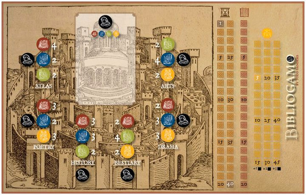 Needed to play: the game board showing the city of Bibliogamo, the 47 Artisan cards, the 7 Prestige Collection cards, 26 black eurocubes representing your Artisans, and 16 red eurocubes to act as track markers in the game. Additionally you’ll need one pawn to represent the Librarian.