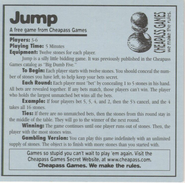 Big Dumb Five was published in the Origins 2000 Preregistration Book as Jump and has also appeared on the Cheapass website and in their printed catalog. It is included in Chief Herman's Holiday Fun Pack.