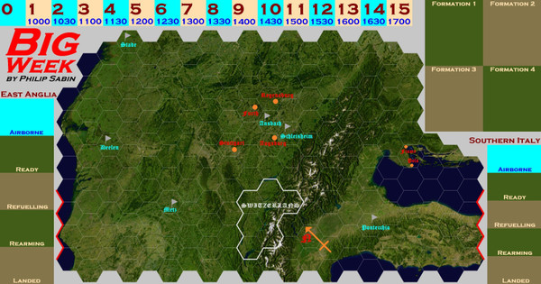 "This is a simulation game of US strategic bombing raids from England and Italy on 25 February 1944, the last day of the `Big Week' offensive. Two or three players or teams direct the actions of the opposing air forces as they seek to inflict more damage than they suffer in this attritional contest."