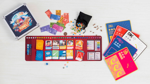 Bigtop Rumble it’s an engine building game where 2-5 players compete to create the best show and attract the larger audience. Each player can select one of the 5 real contemporary circuses companies and create a show with card depicting real artists!