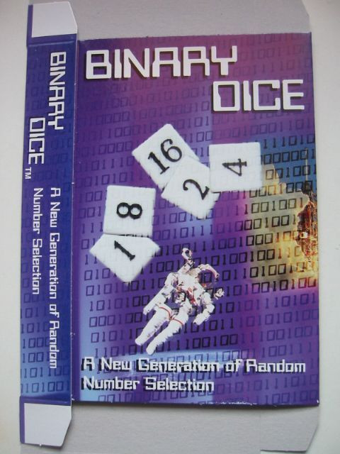 BINARY DICE are the hottest and most versatile new concept in dice since the cube was invented. A single set of BINARY DICE can replace all those multi-sided dice: with 4, 6, 8, 10, 12, 16, 20 and 30 sides. Simply use as many BINARY DICE as needed in each case: the two or three lowest in an ordinary family game, or all five for deciding an important outcome to within a resolution of 3%.