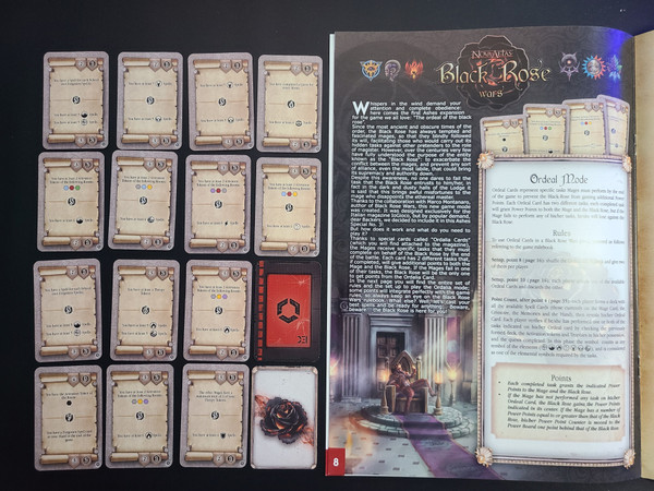 In game setup, each mage will get 2 Ordeal Cards of which 1 must be kept. The Ordeal Card will show 2 objectives that can each provide additional points for the mage in end-game scoring when met. However, if none of the objectives are met then the Black Rose will receive a significant amount of points.