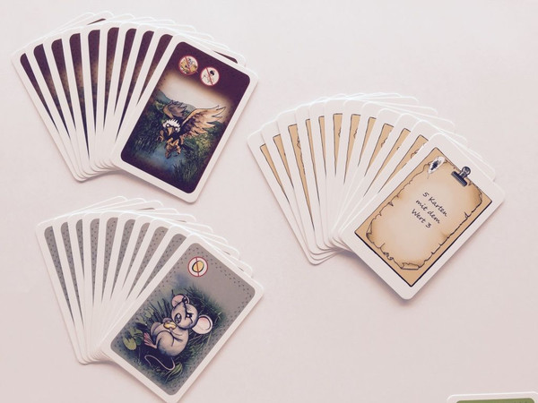 Mice and Hawks: Take a mouse for every chicken card you acquire during the auction phase showing a mouse. Take a hawk for every hawk on a chicken card you get during an auction (not in case of payment by another player). At the end of the game, every hawk eats a mouse (and a blind hen, if there is no mouse in your display) and every surviving mouse eats a corn.
