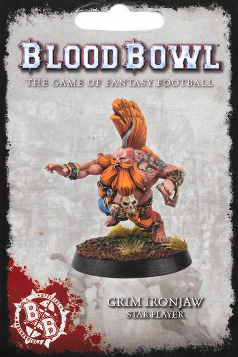 Field Grim Ironjaw as a Star Player in your Dwarf Blood Bowl team with this resin kit. He’s a particularly stocky example of Dwarf strength, with bulging muscles beneath a frankly glorious beard featuring plaited-in details (skulls! He has skulls in his beard!) His mohawk is tall, and his fist clutches a terrifying-looking blade – truly, he’s an all-crushing Slayer and a half.