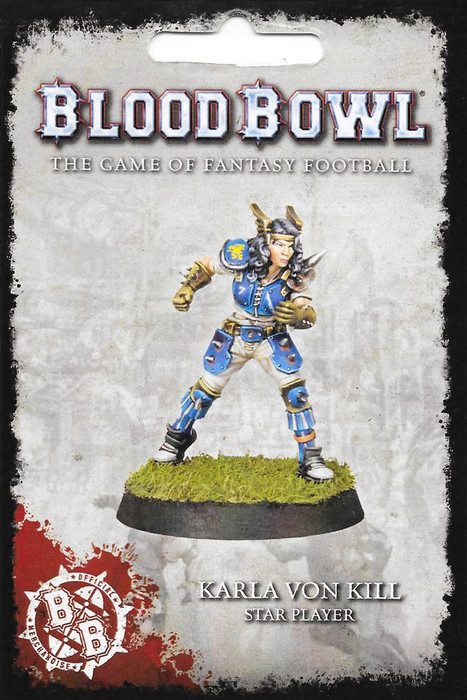 Karla von Kill is a Star Player who can be included in the following teams: Amazon, Halfling, Human, Norse. This highly detailed miniature makes a fantastic addition to any team that can afford to hire her.