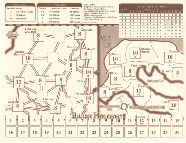 An LPS bonus mini-game, Bloody Hunlikely! is a solitaire treatment of Attila the Hun's Western Campaigns of 452 and 453 AD.