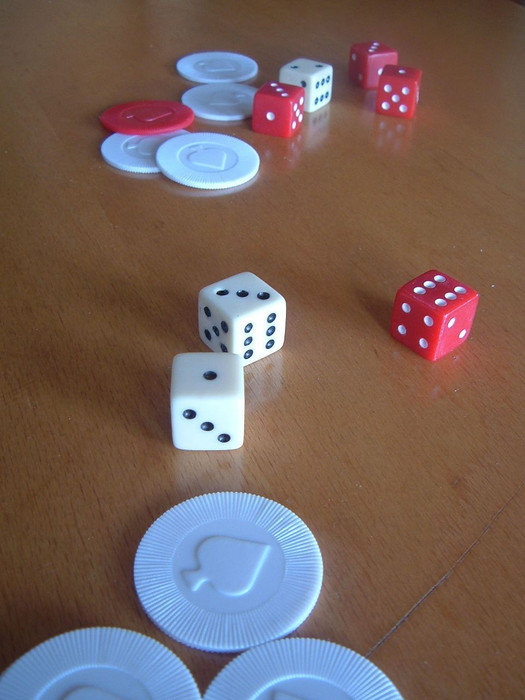 Bogart is a quick push-your-luck dice game. Each turn, the acting player places one chip from the bank into the pot and rolls one die. If the roll is a one (the player 'aces out'), the turn is over. Otherwise, the player take the pot. Alternatively, the player may add two chips to the pot and roll two dice. If either roll is an ace, the turn is over. This continues until the player aces out, takes the pot, or rolls five dice without acing out - which is an instant win. If no player scores an instant win, the first player to collect thirty chips wins.