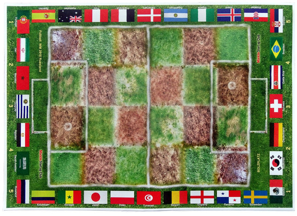 The beginning player sets his ball on the marked spot in his right goal space. Both players roll a die and the ball is moved a number of spaces equal the difference of both results. If a double is rolled the opponent wins ownership the ball (the ball is flipped to the side of the opponent's color). After the ball has crossed the middle line, the higher number decides who owns the ball, but movement is still according to the difference of the rolled numbers.