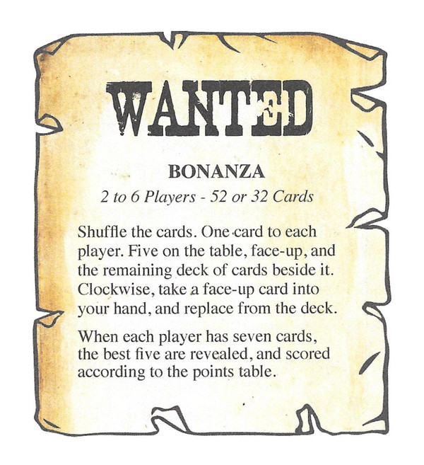 One card is dealt to each player. Five cards are placed face-up to the table. In playing order, each player takes a face-up card from the displayed selection, then replaces the drawn card with a new card from the deck. This is done in turn order until each player has 7 cards in their hand. They then reveal their hands. The best 5 card poker hand wins. The game can be played in multiple rounds for score. With 1 to 4 players, it is recommended to play with a short 32 card deck (7 through Ace) instead of the standard 52 card deck.