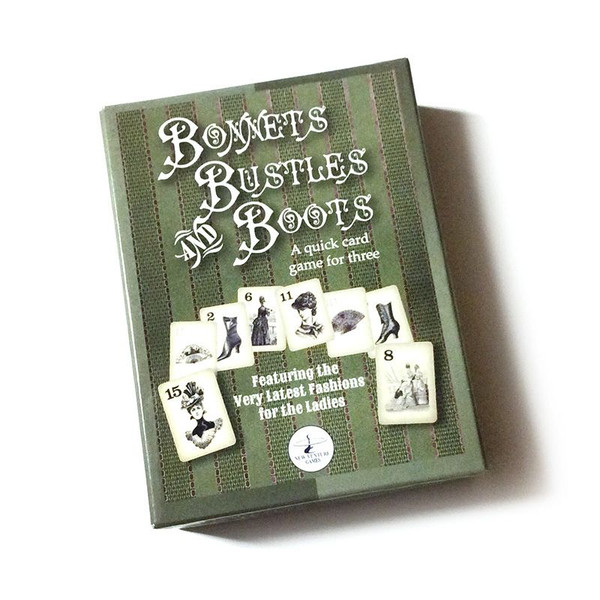 In the late 19th century, families and friends would gather in their parlors to play games. It was an aspect of their social life and a stage for the strict etiquette of the day. This three-handed card game would have been perfect for the Victorian courting sensibilities, played by a young couple and their chaperone. By playing your cards carefully you will gain cards that will contribute to your final score. However, you can decide to use a scoring card to win a different (and perhaps better) card. A very light, unique game for three that can be played almost anywhere by anyone, depicting the latest fashions of the 1880s. Remember the "good old days."