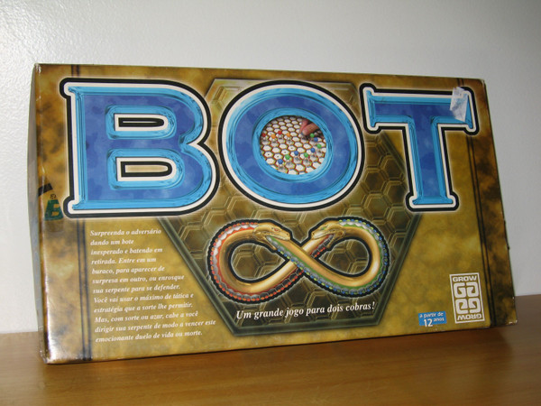A relaunch of a late 70s release, Bot is a game in which each of the two players command a "serpent" abstractly represented as a line of pawns occupying successive hexes in the gameboard. Players organize and play their hand of cards to direct their serpents' linear movement across the board. To each hexside corresponds a color; each card has a color and a number. Thus, a Yellow-3 card allows a player to move his serpent three hexes in the Yellow direction. Once a serpent successfully reaches (hits) the opposing serpent, it "eats" and removes two of the attacked serpent's pawns from the game. The same cannibalistic result is achieved if you successfully drive your serpent towards the enemy home base. Serpents may defend by biting their own tail, forming an impregnable ring, or by using the board's "underground tunnel" for a quick escape. First player to reduce the enemy serpent to nothingness is the winner. The name Bot is a homophone for "bote", a Brazilian Portuguese noun meaning "serpent strike".