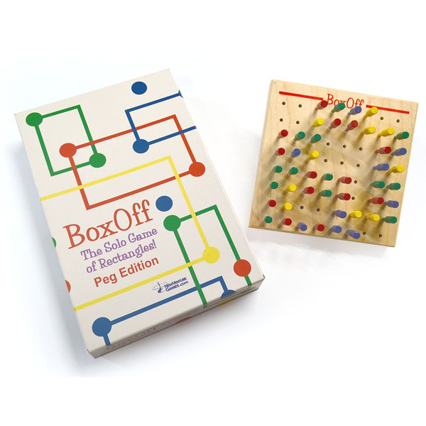 This game was first described in Games Magazine in 2013, and later in the Abstract Games magazine in 2020. There have been electronic versions for iOS and Android. BoxOff is now being published by NewVenture Games in three versions: a board game, peg game, and travel-size.