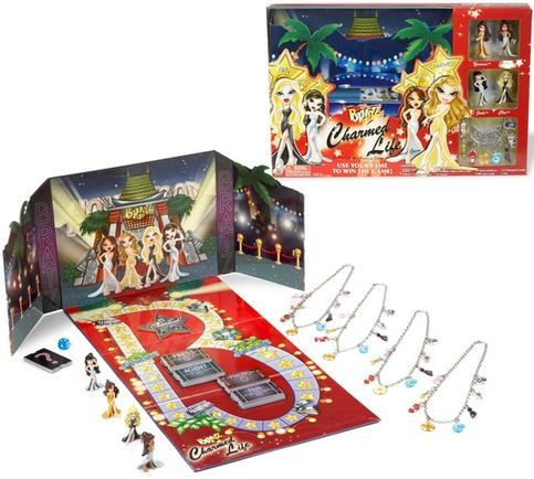 Game includes: red carpet backdrop game board, 4 molded BRATZ girl game pieces, 32 charms (8 per girl), 4 charm necklaces, 120 game cards (photo, press, agent and fan), 12 charmed cards, 16 multiple-choice letter cards, 4 yes/no cards and die.
