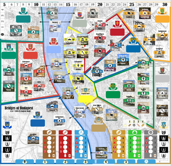 The Bridges of Budapest is a game about the unification of the cities Buda, Obuda, and Pest in the second half of the 19th Century. These cities sat on either side of the River Danube and only became one when the Szechenyi Chain Bridge was built across the river. In this game, you will design and build the famous bridges and buildings that earned Budapest the soubriquet "The Pearl of the Danube"