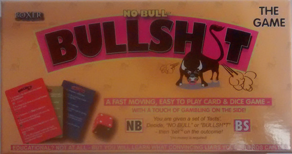 A trivia card game. There are three decks of cards, each contain a list of numbered facts, some true ('no bull') and some false ('bullshit'). Players take turns to be read one fact from a card, chosen by a die roll, and must decide if that fact is true or false. If they are correct they keep the card used, if they are wrong the card is returned to the bottom of the deck. Confident players may 'bet' 1, 2 or 3 cards on their answer; if they are correct they will receive this many extra cards from the current deck, if they are wrong they must pay that many cards back to the deck.