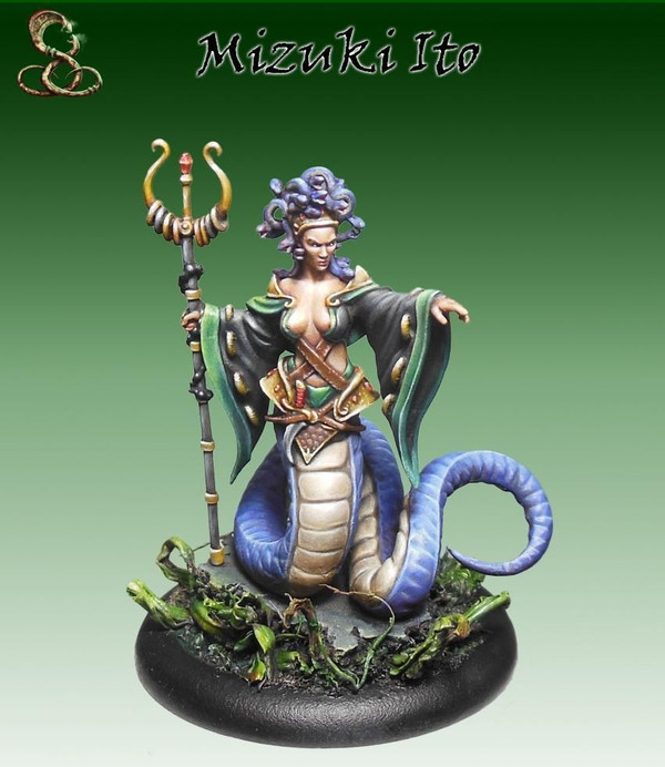 Another daughter of the Ito clan succumbed to the temptation of Orochi’s Blessing. Once a beautiful child of the Ito, with many a samurai lord interested in claiming her hand for a son. That was all before she started the visions that led her to her one and only partner, for now she is wed to Orochi. The Blessing awakening a deep power within her, granting her the power to grant minor gifts to fellow believers to conduct Orochi’s bidding. Her gaze able to bend the minds of even the most resolute to her own ends or freeze them in place until they might serve a purpose for this deadly and beautiful Shugenja of the Ito.