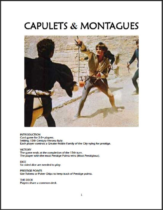 Card game for 2-6 Players. Each player controls a noble house in 13th Century Verona Italy. Each Family is described by the Traits of: Blood, Wealth, Favor, Dignity, and Vigor. Players share a common deck. Each turn 7 cards are drawn and players take turns picking cards they want. Cards will modify a players traits up and down. The Leader in a Trait will gain Prestige Points. Vigor Determines Turn order. Blood Cards anger the Prince of the city and may lead to punishments. Favor can be used to avoid punishments. At the end of 10 turns the player with the greatest Prestige wins. Complete rules are available for free.