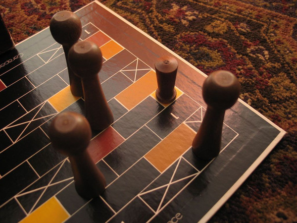 The board is composed of rectangular spaces arranged like bricks in a wall, making it effectively hexagonal. There are blocked spaces where no one can move, and three sets of differently colored "closable" spaces - when an offensive piece is on a colored square, similarly colored squares are off limits to the defense. There are also squares numbered 1 - 3; when a defensive piece lands on one of these, the number is added to the offensive player's move total.