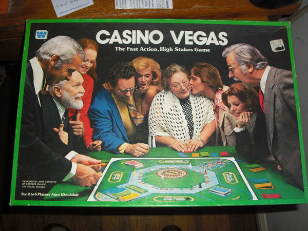 A roll and move styled game, where the object is to accumulate the most money by playing Black Jack, Poker, Roulette, Craps and slot machines. You play each casino styled game for one round when you land on the gambling spot for it. Player's play against the "house" with another player performing the house position for the turn. The other players may perform side bets on the outcome while the gambling game progresses. The rules for each gambling game are abbreviated somewhat, but there is an entire Roulette layout with a spinner for the wheel along with the other layouts on the board. One space is a bank space where more money may be obtained.