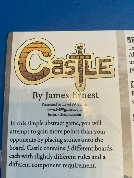 In this simple abstract game, you will attempt to gain more points than your opponents by placing stones onto the board. Castle contains 3 different boards, each with slightly different rules and a different component requirement.