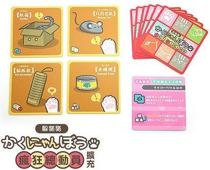 The expansion pack Cat Hiding Plus adds four different types of cards to either Cat Hiding or Cat Hiding DX, with these cards being played from the hand to peek at two cat cards in play or swap one goal for another.