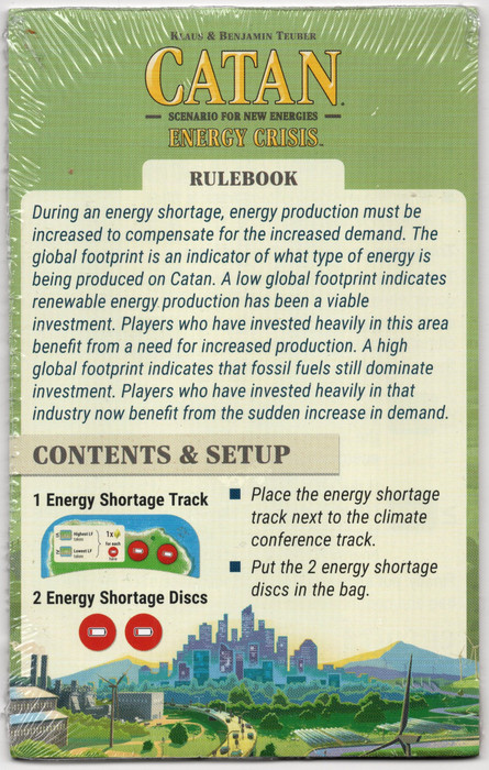 During an energy shortage, energy production must be increased to compensate for the increased demand. The global footprint is an indicator of what type of energy is being produced on Catan. A low global footprint indicates renewable energy production has been a viable investment. Players who have invested heavily in this area benefit from a need for increased production. A high global footprint indicates that fossil fuels still dominate investment. Players who have invested heavily in that industry now benefit from the sudden increase in demand.
