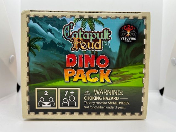 Inside the box you will find two dino launchers, a rubber boulder, cards and standees. Use the dino launchers instead of catapults when playing Catapult Feud, or you can use the cards and standees for target practice!