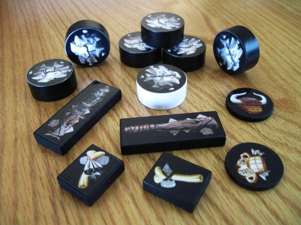 Exclusive to Kickstarter backers only—a Black Sheep of each of the clans has returned to participate in this Caveman Curling event. Only one such rock per clan exists. It counts double the points of any of the other rocks. Each team must strategize as to when and how to play this special rock.