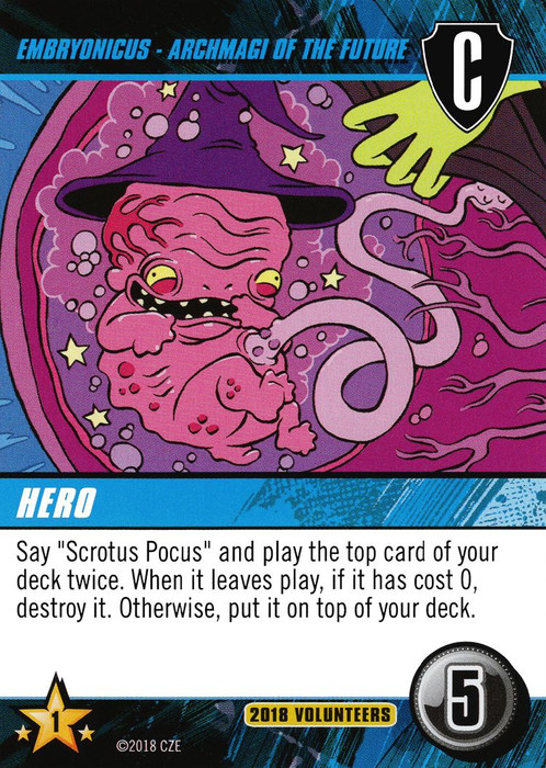 Say "Scrotus Pocus" and play the top card of your deck twice. When it leaves play, if it has cost 0, destroy it. Otherwise, put it on top of your deck.