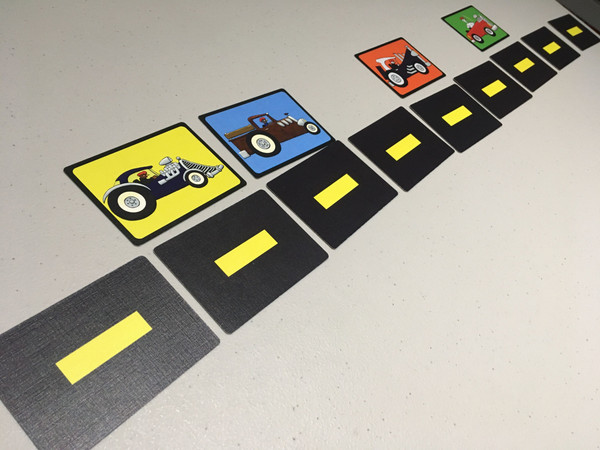 Chicken is a quick, press-your-luck party game for 4-16 players. Based on hot-rod drag-racing, players race towards the edge of a cliff to see who can get closest without going over. Each round the road cards are placed face down. Players then places their marker where they would like to stop. Road cards are flipped over one at a time, with each road card being worth one or two points and the cliff is worth three. Players earn all points from the beginning to where they stop, unless they go over the cliff and forfeit all points gained for the round. The first player to 30 points wins.