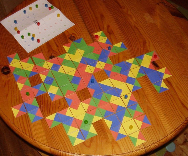 Players lays the tiles on the table to form (blue, red ,green or yellow) color areas and try to finish these to score.