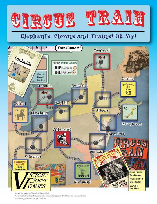 Circus Train, by designer Tom Decker, is a 1-5 player game in which you are the owner and operator of a small circus train in prohibition-era America. In this game, you and your opponents are vying to employ the best talent while putting on the most magnificent show each month. While touring the country by train, you will have the opportunity to perform while adding talent to your show through hiring the performers stranded in cities by defunct circuses. Just remember to keep an eye on your wages, because your talent definitely will.