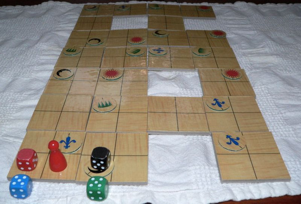Reach the top of the rock wall to complete this solitaire game, which uses a standard piecepack. In the game, you control the climber's hands and feet and also the position of the body in relation to the extremities. Find a way to move upwards choosing spots that are strong enough to support your weight.