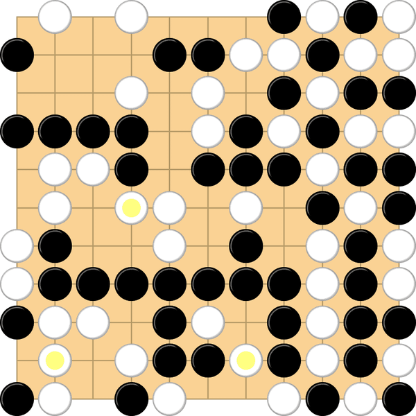 When the board is full, the player with fewer stones on the board wins. If there is a tie, whoever placed the last stone wins. Ties are only possible on even-sized boards.