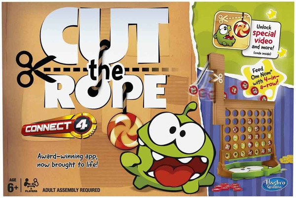 The award-winning CUT THE ROPE app is brought to life with CONNECT 4 CUT THE ROPE. OM NOM is a curious little monster who loves to eat candy. But you need to get the pretend treats into his mouth first. Swing the rope to land 4 candy discs in a row. First to four gets to release the goodies and feed OM NOM!