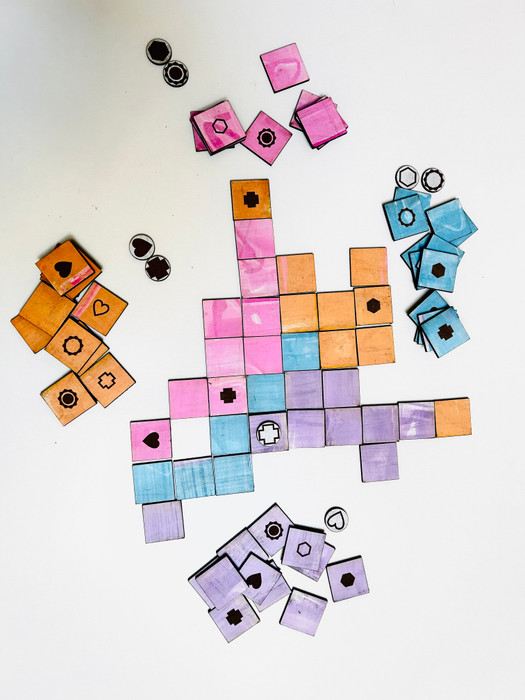 Players take turns placing one tile at a time. Tiles must be placed adjacent to any existing tile, edge to edge or corner to corner. When a secret symbol is used, a tile matching the symbol can be placed on top of that tile.