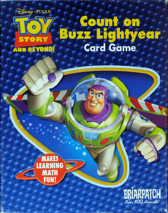Count on Buzz Lightyear is a card game in which players must get rid of cards in their hands by creating math equations. Each time an equation can be made, using one card from the hand and two cards from the table, the player gets to put down the card from the hand that was used. When one player has rid himself of all cards in his hand, the other players add up the points left in their hands and another round is dealt. Play continues until all players but one have passed 50 points.