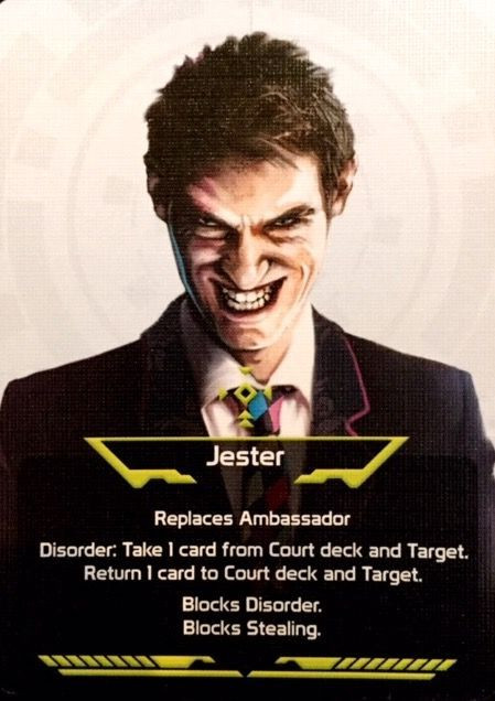 A player claiming the Jester role may cause Disorder, taking a card from the Court deck and a card from the Target (another player of their choice). The player may secretly change one of their cards for one of the cards received. The player then returns a card to the Court deck and a card to their Target.