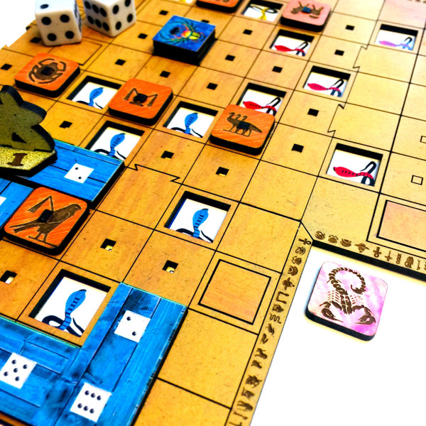 Reach the center of the temple and escape with a valuable treasure, but beware of the scorpion which your opponent will unleash. Play in rounds until all treasures have been recovered. Each round has three phases: