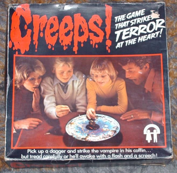 Manufacturers Blurb: Creeps! The game that strikes terror at the heart! Pick up a dagger and strike the vampire in his coffin... but tread carefully or he'll awake with a flash and a screech!