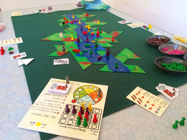 Begin by laying river tiles and placing initial dam pieces. Move through the three turn phases in each season. Lay terrain tiles, send out beavers to gather resources, build dams and lodges and watch your beaver colony grow. Fortify your lodges before winter or your baby beavers will perish. And at all times beware the wolverine! With each passing year when the river floods, the landscape changes more and more due to your damming activities.