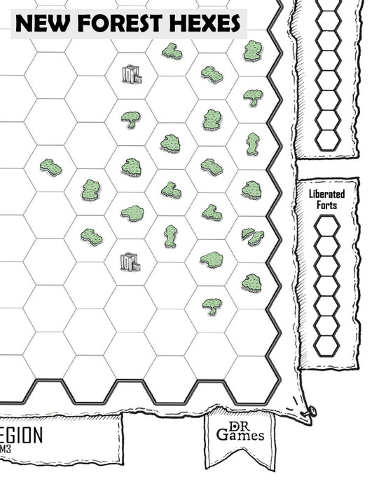 These are the Forest Expansion rules for Dark Force Incursion (DFI), a roll and write game that is for one person, taking 20 to 40 minutes to play. This expansion deals with the addition of the forest hex tile to the game.