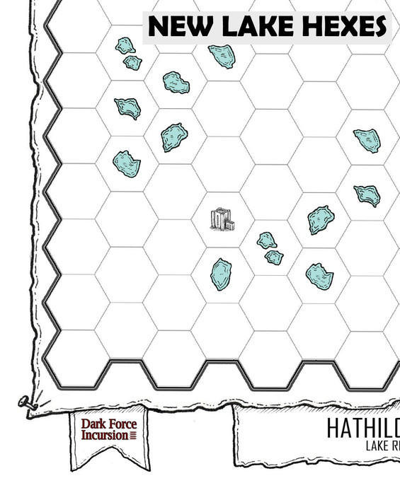 These are the Lakes Expansion rules for Dark Force Incursion (DFI), a roll and write game that is for one person, taking 20 to 40 minutes to play. This expansion deals with the addition of the lake hex tile to the game.