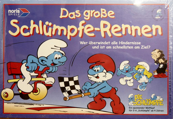 In this running/dice game the Smurfs organize a race, each player chooses a figure, the Smurf cards are placed face down on the game board at the beginning. The player on the turn rolls the dice once and moves on by the number of dice rolled, whoever rolls a 6 may roll the dice again and move, foreign figures are skipped, there can be several figures on one field. At the end of the turn, you perform the event that belongs to the square you landed on - on some squares you get cards that bring you to Gargamel's castle or save you from it. The first player to get his figure back to the start/finish square is the winner.