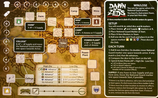 1) Roll 2 non-Zed dice. On doubles move National Guard marker one space towards Arrive. If any match a Zed, that die advances.