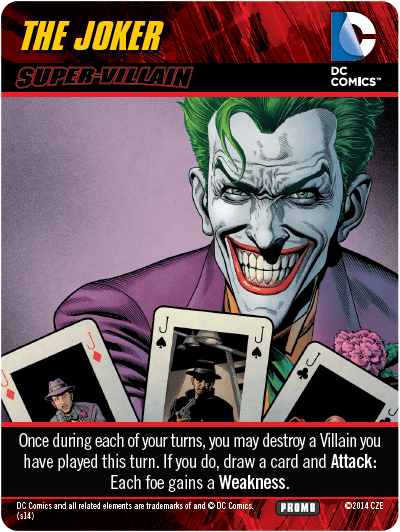 Promo initially distributed at the 2015 Origins Game Fair. The text of this oversized Super-Villain Character card reads "Once during each of your turns, you may destroy a Villain you have played this turn. If you do, draw a card and ATTACK: Each foe gains a WEAKNESS."