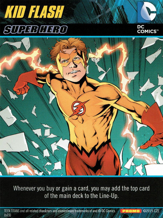 As with every other hero, Kid Flash grants a special ability to the player, which in this case is: "Whenever you buy or gain a card, you may add the top card of the main deck to the Line-Up."