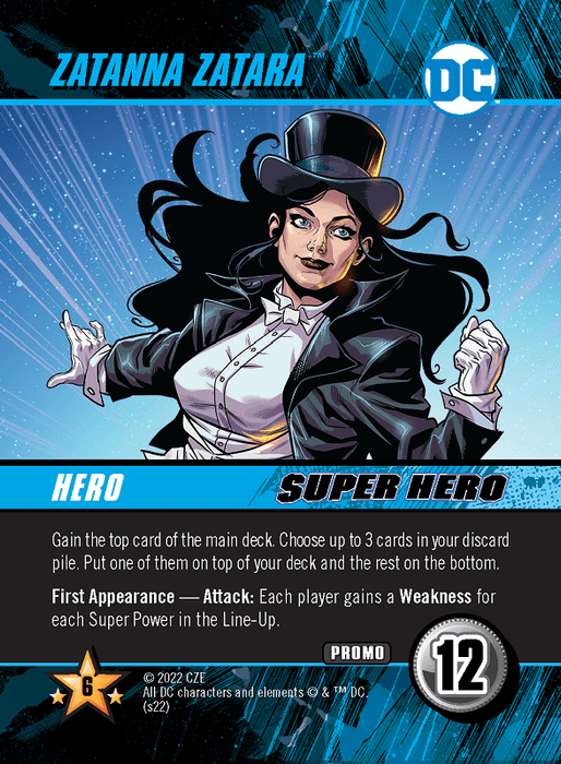 Zatanna Zatara is a super hero for use with Forever Evil or Injustice. She costs 12 to defeat, and has the following abilities: