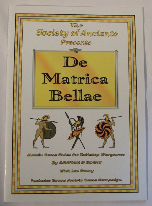 De Matrica Bellae is a set of matrix game rules for tabletop wargames by Graham D. Evans and was published as the Society of Ancients incentive game for 2005. The matrix style of play often produces an anarchic type of game and also needs an umpire, but can produce an entertaining game that is good fun and can provide a lot of value to the wargamer. DMB also includes a bonus matrix game campaign, "Londinium's Burning" - a matrix version of the Iceni revolt led by Boudicca.