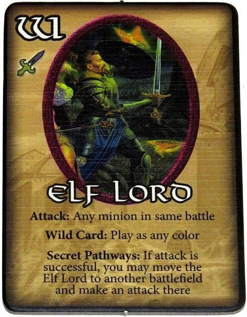 Game Play: When the Hero player is playing one of their Wild cards, they may discard the Wild card rather than using the ability and draw one of the face down Elf Lord Wild tiles playing it instead. This is an optional action enabling the player to play the original Wild card or choose to play the Elf Lord. They make this decision prior to seeing the Elf Lord card.
